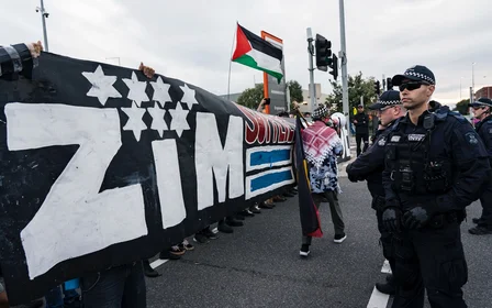 The protesters on Sunday prevented workers from getting to their jobs at the port, and some of them have held up banners with the words "block Zim ships".