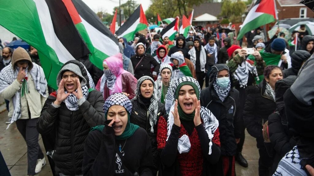 Residents of Detroit and the Arab Community of Dearborn march in support of Palestinians in the ongoing war in Gaza, in Dearborn, Michigan on 14 October 2023 (Matthew Hatcher/Getty Images via AFP)