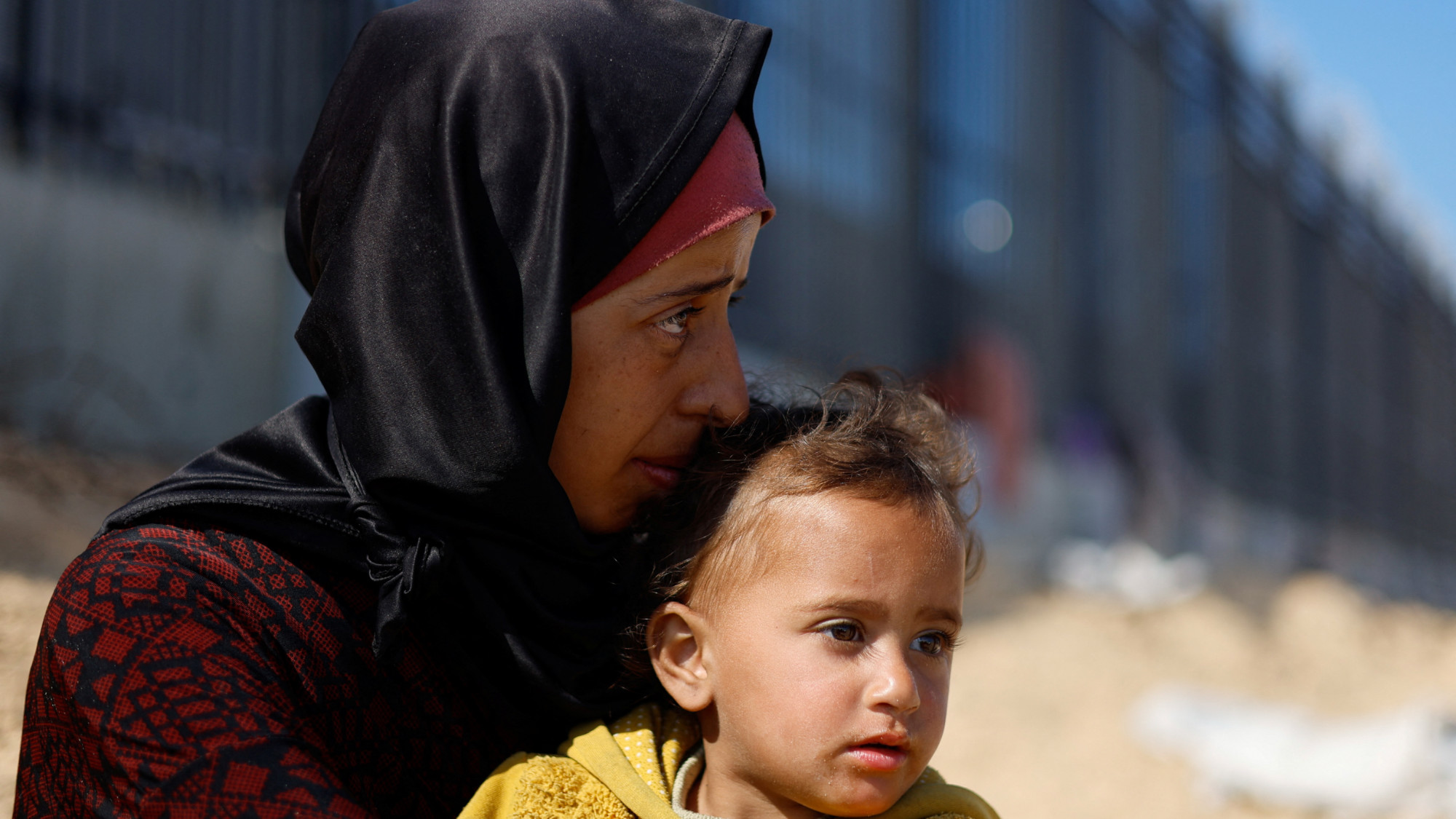 A woman sits with a child, displaced Palestinians who fled their homes due to Israeli strikes, take shelter in a tent camp in Rafah, in the southern Gaza Strip near the border with Egypt, 6 February 2024 (Reuters/Mohammed Salem)