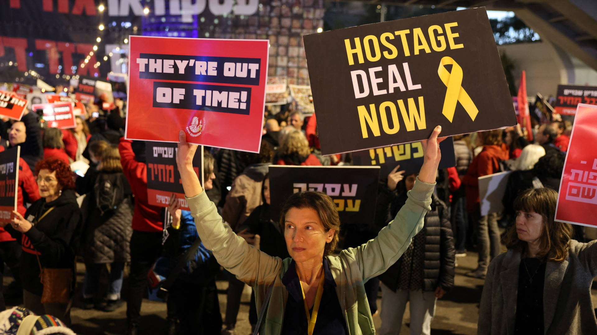 Relatives and supporters lift placards bearing portraits of Israeli captives held in Gaza during a rally in Tel Aviv on 8 February 2024 (AFP)