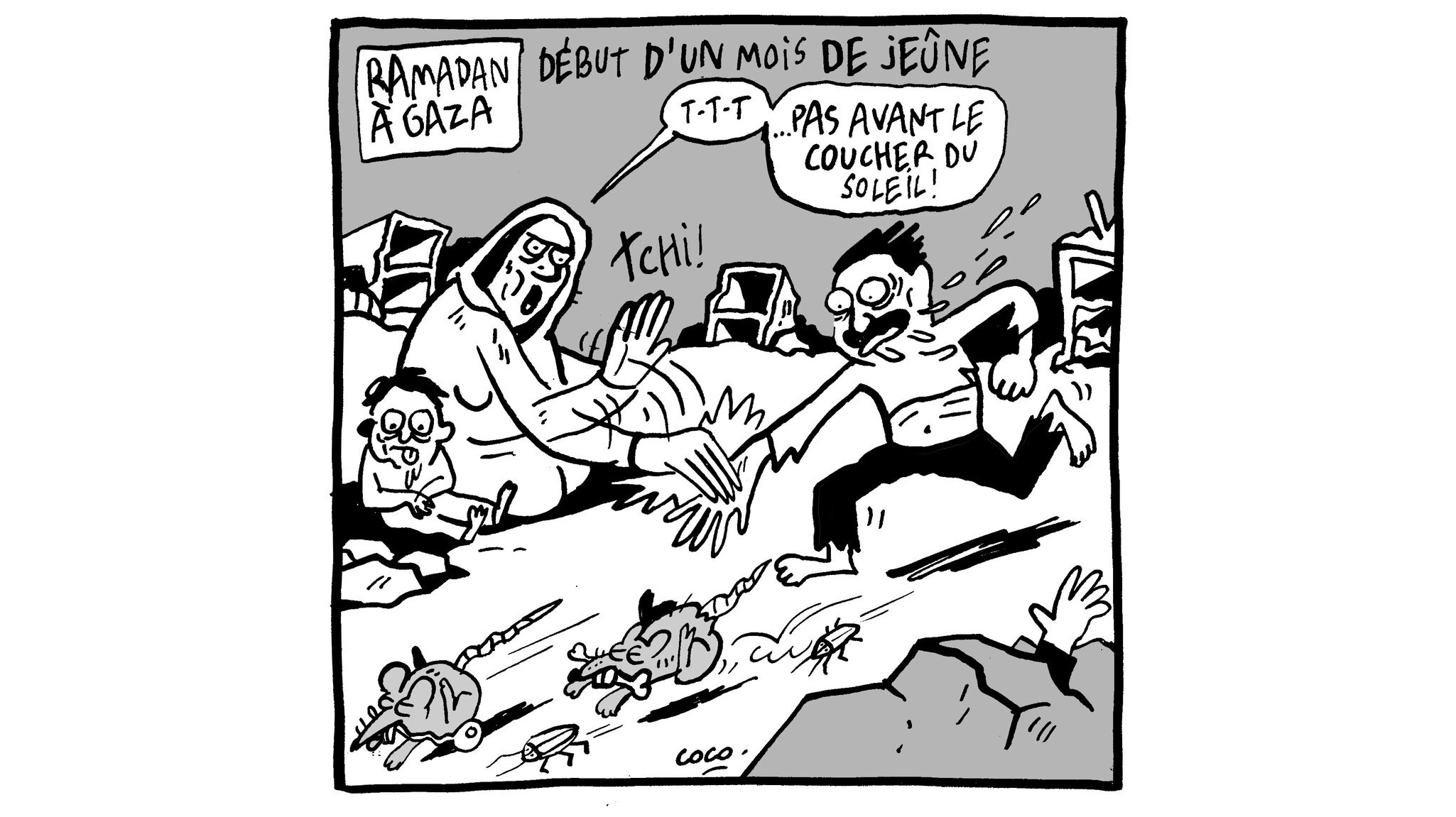 The cartoon by artist Corinne Rey depicts an emaciated Palestinian man chasing after rats and cockroaches amid rubble and destroyed buildings. A woman in the cartoon slaps his hands and admonishes him, stating: "Not before sunset."