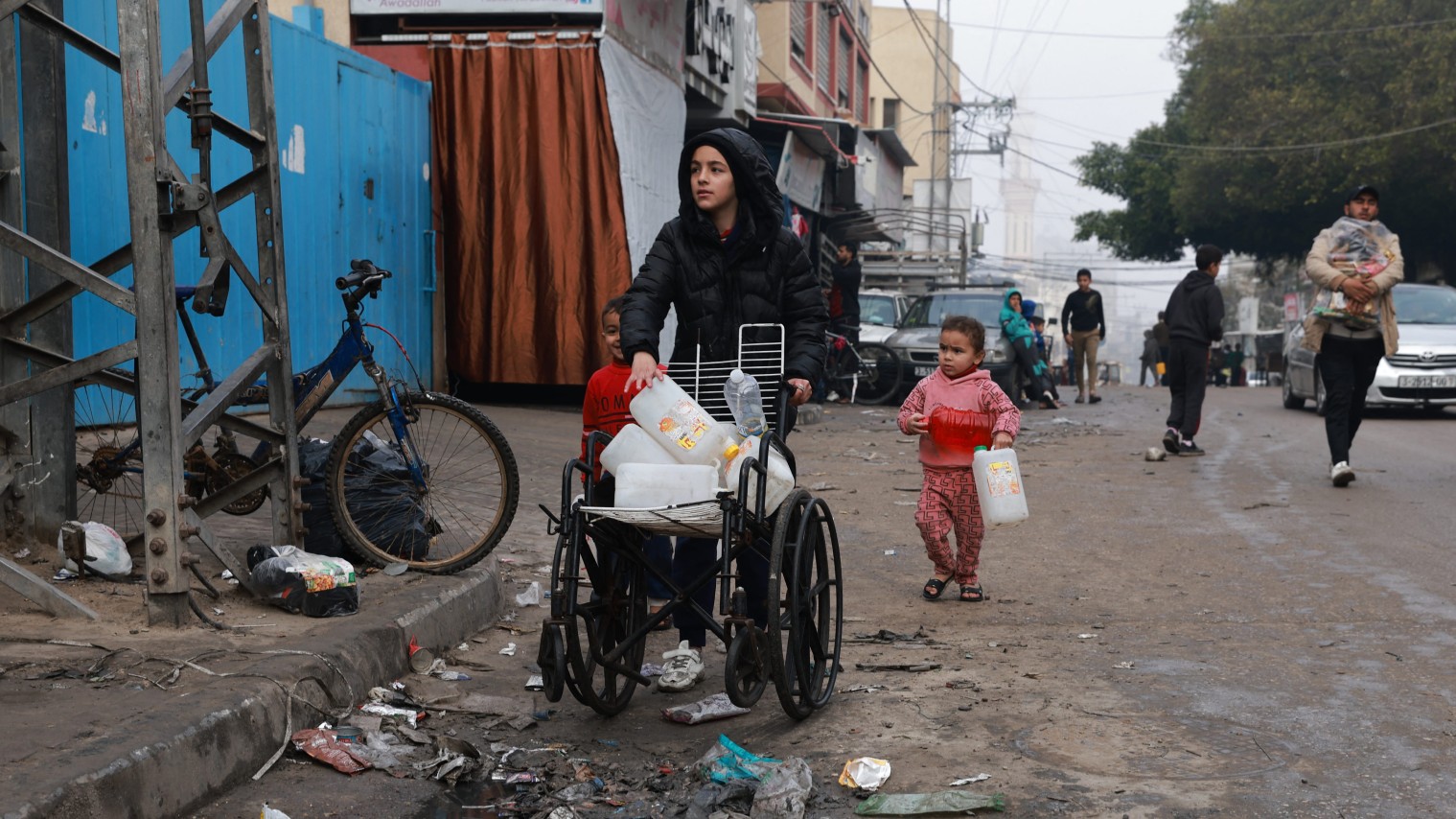 A child transports empty bottles on a wheelchair, on his way to fetch water in Rafah in the southern Gaza Strip, on 9 February 2024 (AFP)