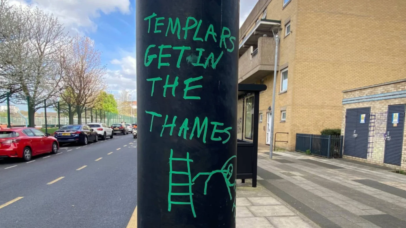 Indeed, the only reminder of the controversy is some graffiti on the bus shelter at the stop, which carries the slogan "Falastin Hurra", Arabic for "Free Palestine". There are also drawings of ladders: one on the lamppost shows a stick man falling off, next to the slogan "Templars, get in the Thames", a reference to the Crusaders.