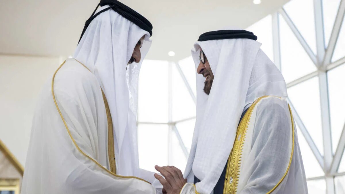 United Arab Emirates' President Sheikh Mohammed bin Zayed al-Nahyan (R) being welcomed by Qatar's Emir Sheikh Tamim bin Hamad al-Thani during a Gulf Cooperation Council meeting in Doha, Qatar, on 5 December 2023 (UAE Presidential Court/AFP)