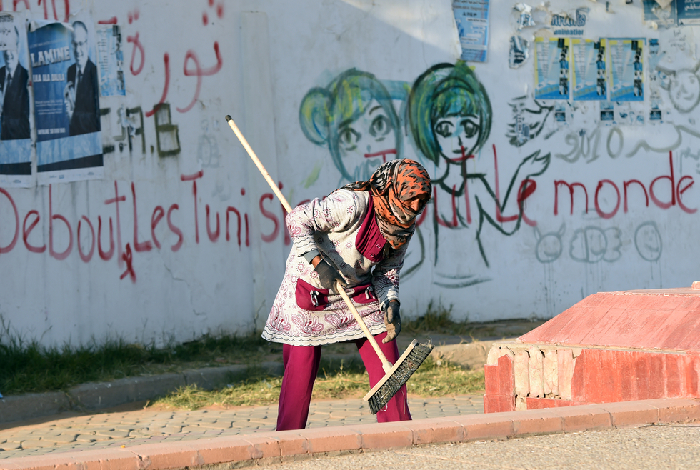 A woman sweeps on Mohamed Bouazizi Avenue in Sidi Bouzid on 14 December, 2015 (AFP)