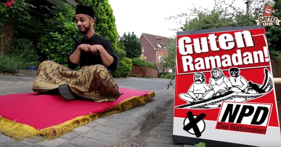A poster for the neo-Nazi NPD party, with its slogan changed to read "Happy Ramadan" (Datteltaeter)