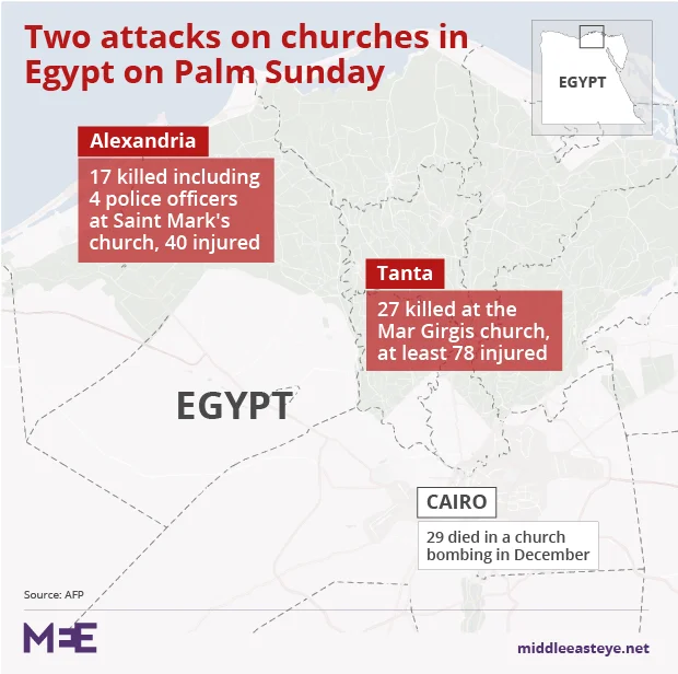 But hours after the bombings, Coptic Christians were digging graves in the basement of the devastated St George Church in the northern Nile Delta city Tanta and at Saint Mark's Cathedral in Alexandria, the historic seat of the Coptic pope.“There has been a lot of neglect and a failure to protect the Coptic community in Egypt,” said Father Daniel Maher in Tanta, where the first of two bombs exploded, killing 27 and wounding around 80.