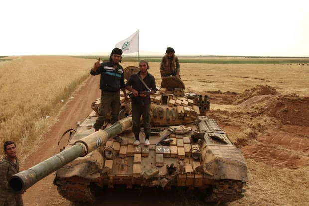 Ahrar fighters posing over tank in a rebel held part of Syria (MEE/Farhad Mirza)