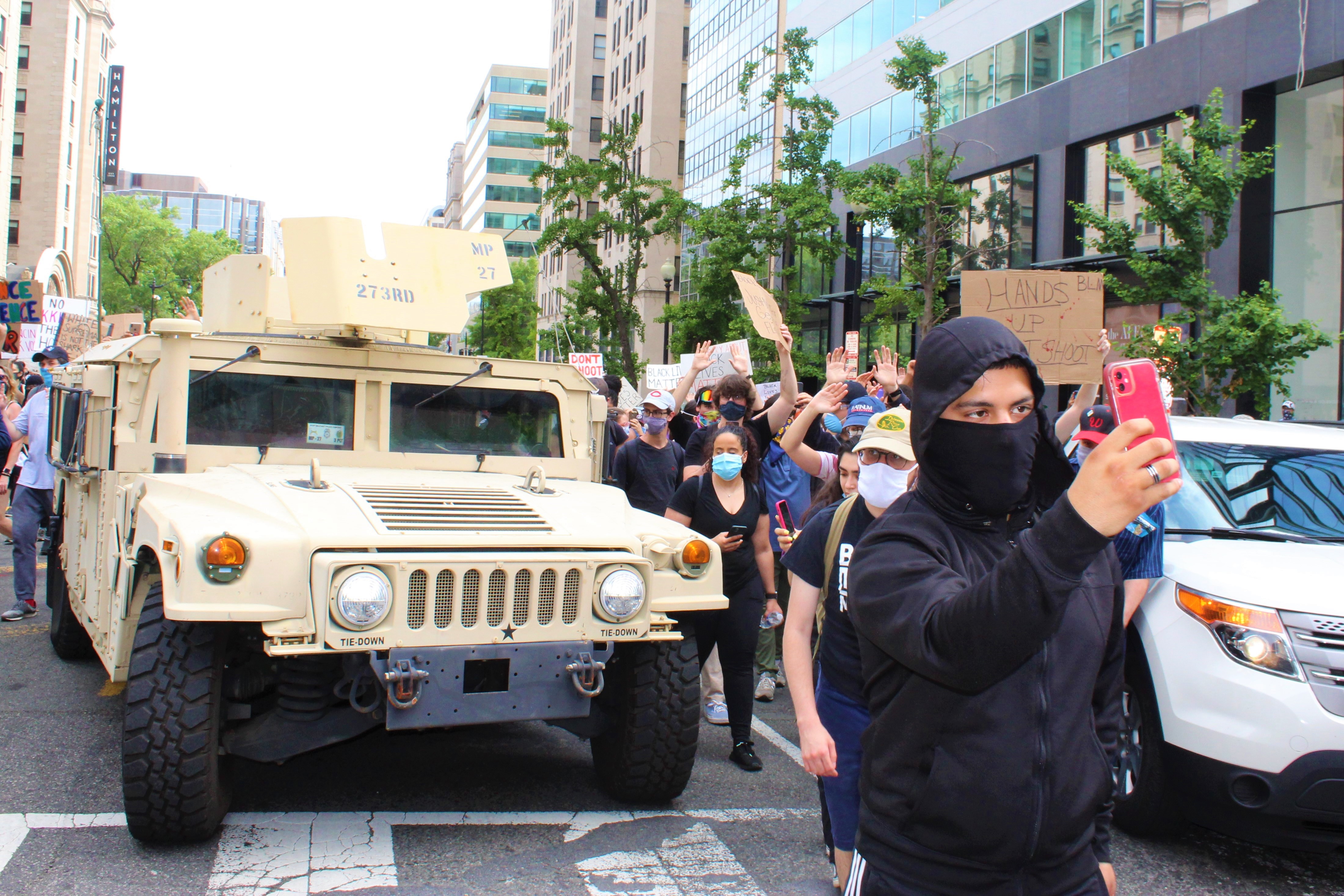 On Monday night, helicopters hovered low over the heads of demonstrators, and on Tuesday, soldiers and armoured military vehicles blocked intersections and flanked protesters in several areas of Washington.
