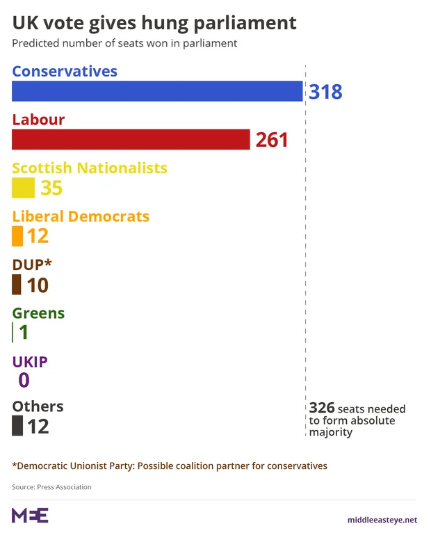 With 649 out of 650 seats declared, the Conservatives had won 318 seats and were therefore no longer able to reach the 326 mark they would need to command a parliamentary majority. Labour had won 261 seats.