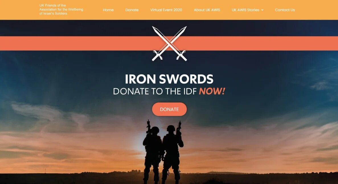 Its website featured a silhouette image of two soldiers under a banner reading: “Iron Swords: Donate to the IDF NOW!”
