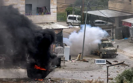 Israel deployed an estimated 120 military vehicles in Jenin on Monday, backed by Apache helicopters which it used to attack Palestinian targets for the first time in the West Bank since 2002.