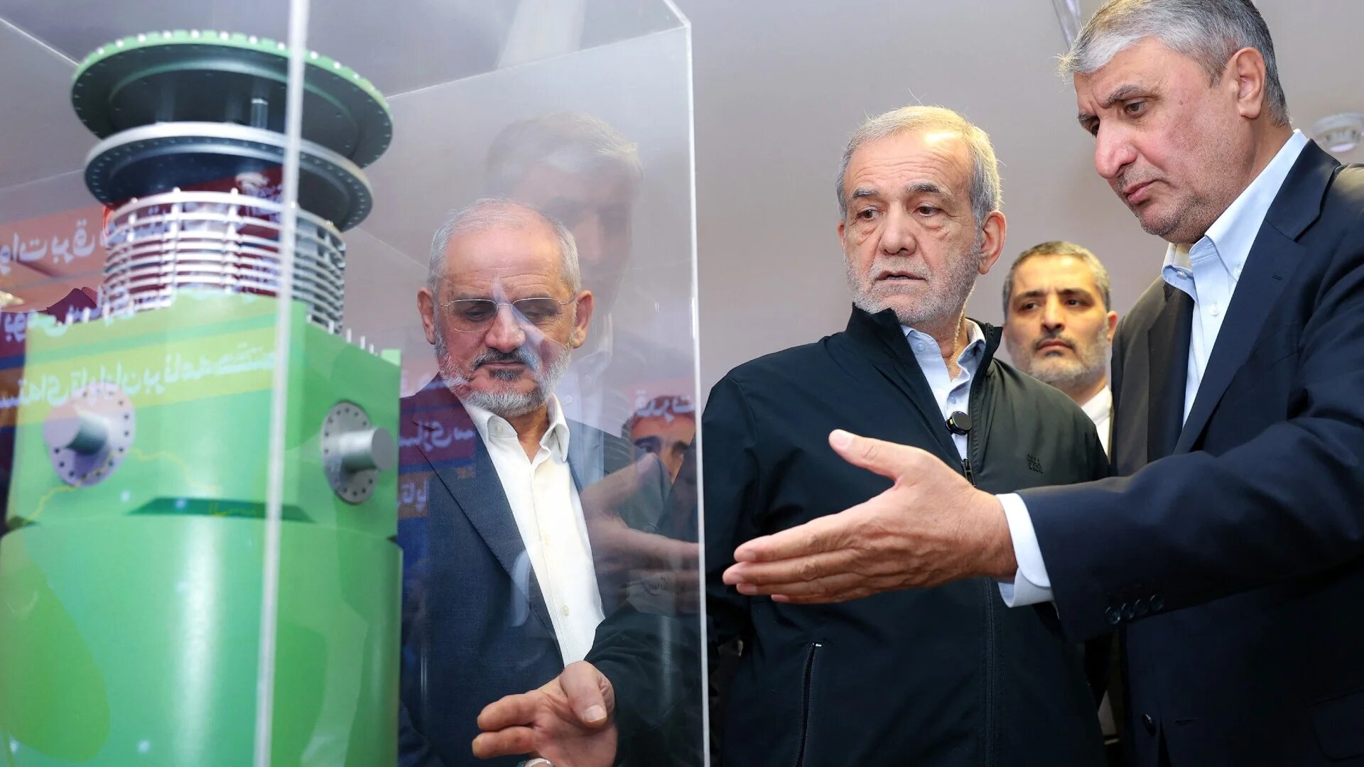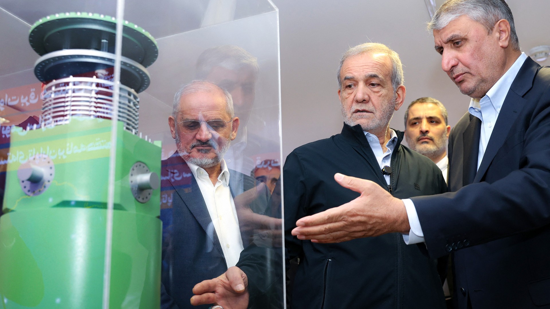 Iranian President Masoud Pezeshkian (centre) and the Atomic Energy Organisation of Iran chief Mohammad Eslami (right) during the 'National Day of Nuclear Technology' in Tehran, on 9 April 2025 (Iranian Presidency/AFP)