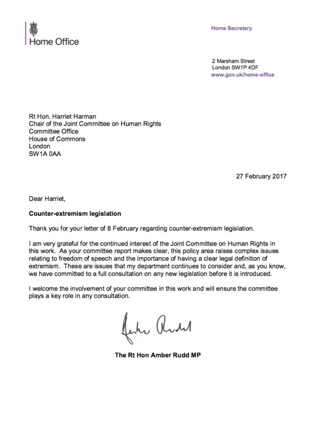 The letter, which is dated Monday 27 February, was published by the parliamentary joint committee on human rights, whose chair, Harriet Harman, had asked Rudd to update the committee on its long-touted plans for a counter-extremism bill.