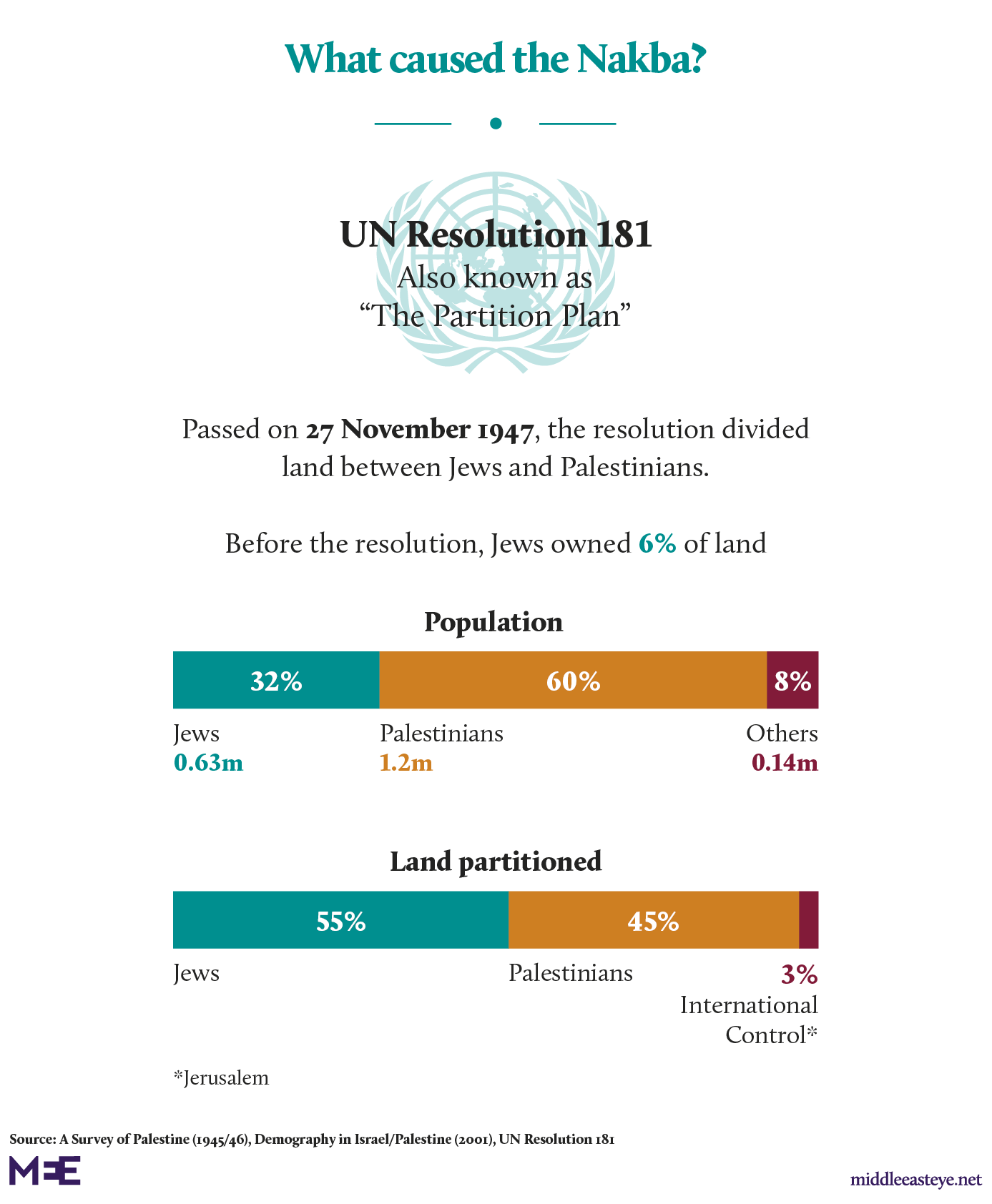 The Nakba was the result of the partition of Mandatory Palestine in 1948 after World War Two ended, as the United Nations and world powers realigned the borders of the Middle East. But many argue that the plan did not take into account populations at the time.