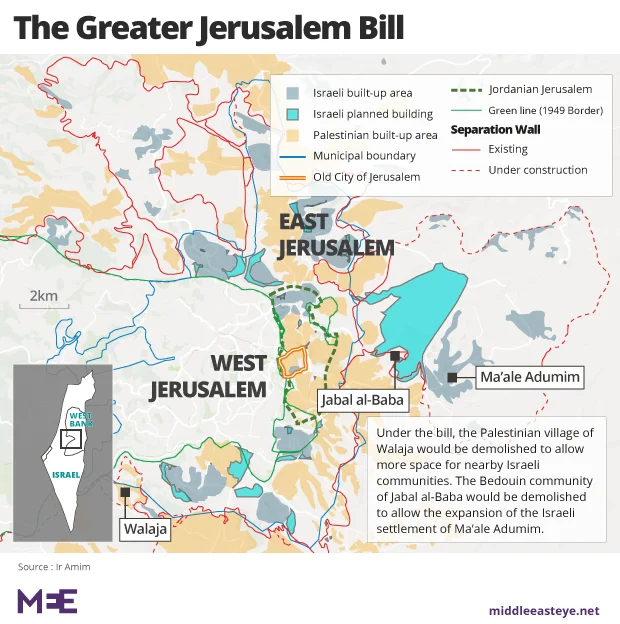 The first  called the Greater Jerusalem Bill is intended to annex several large Jewish settlements close by in the occupied West Bank to the Jerusalem municipality. Overnight that would transform some 150,000 West Bank settlers into Jerusalem residents, as well as effectively annexing their lands to Israel.