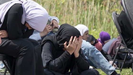 Mourners and supporters gather for a public funeral for members of Afzaal family at the Islamic Centre of Southwest Ontario on 12 June 2021 in London, Canada (AFP)