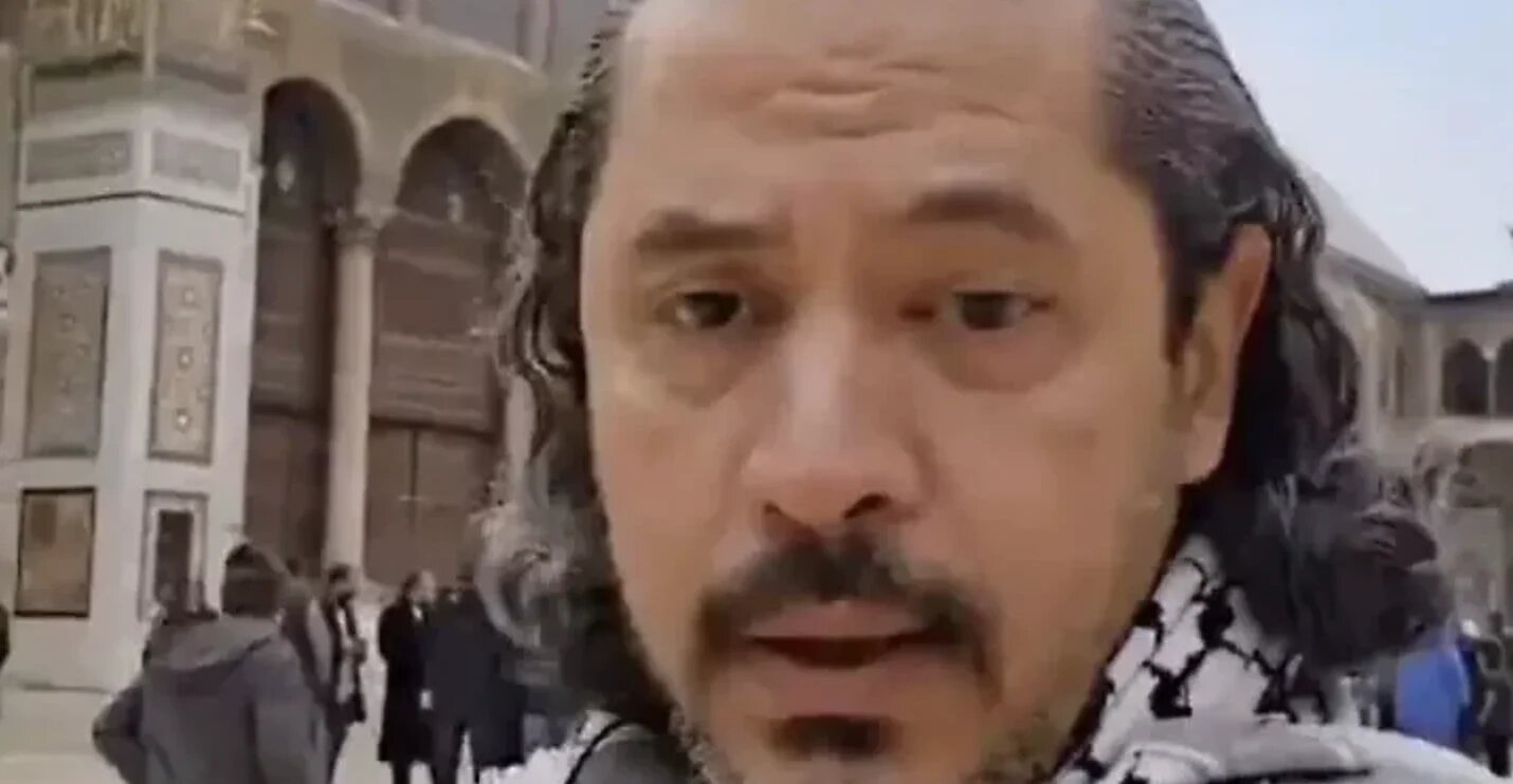 At the site of the historic Umayyad Mosque in Damascus, walking around with a Palestinian black and white keffiyeh around his neck, Abdul Rahman called out the “Zionist Arabs”, referring to the leadership of the UAE, Egypt and Saudi Arabia, and indicated his hope that their governments may be toppled next by a “flood of change”.
