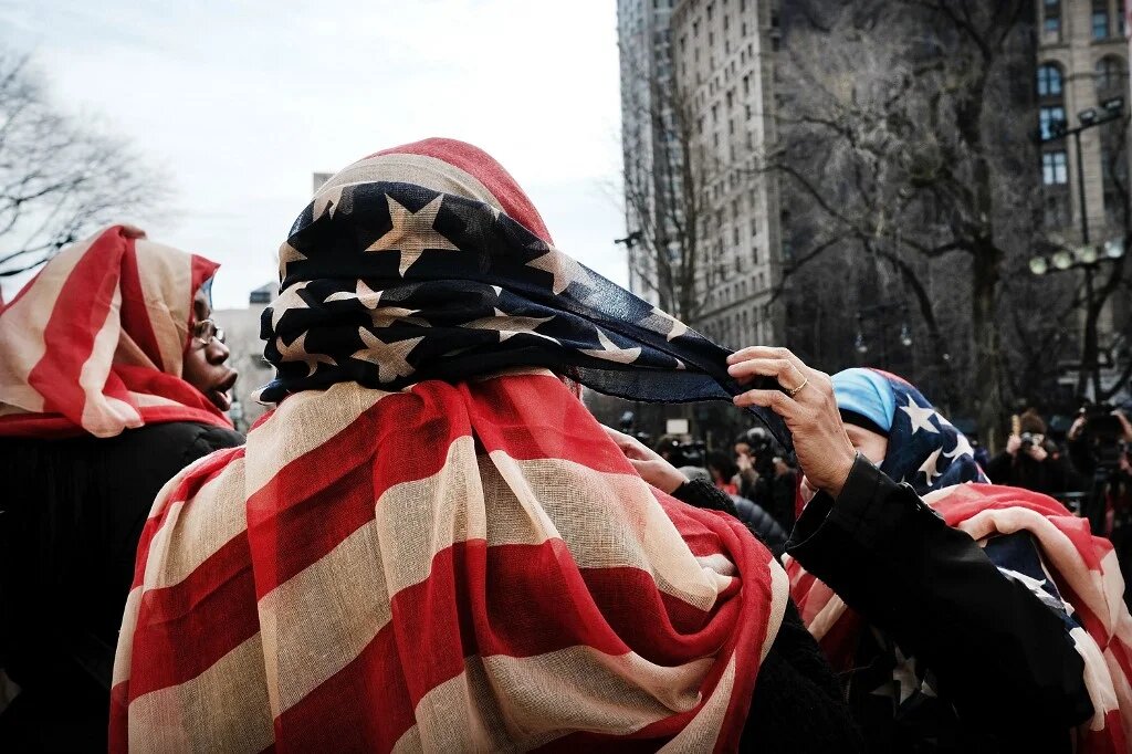 Women wear American Flag headscarves at an event at city hall for World Hijab Day, on 1 February 2017 in New York City (AFP)