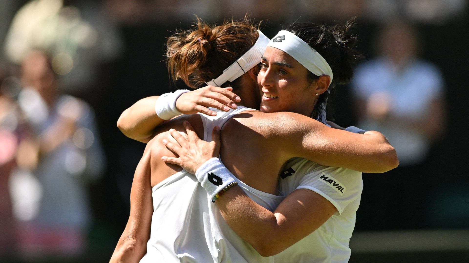 Tunisia's Ons Jabeur hugs Germany's Tatjana Maria after beating her during their women's singles semi final tennis match at Wimbledon, southwest London on 7 July 2022 (AFP)