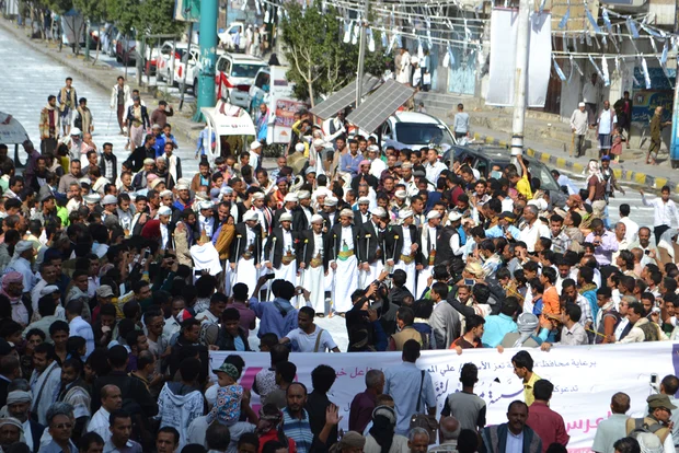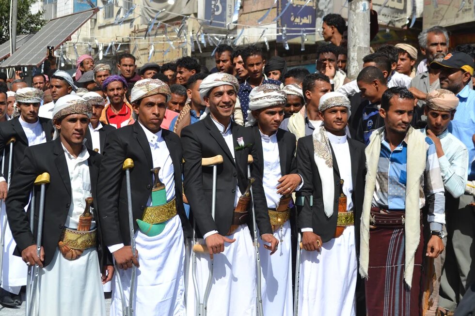 The mass wedding was for fighters who lost either one or both legs in the fight for control of Taiz. It was paid for by a philanthropist and organised by Muath Developmental Foundation, a charitable foundation that helps poor people and victims of the war in Taiz province.