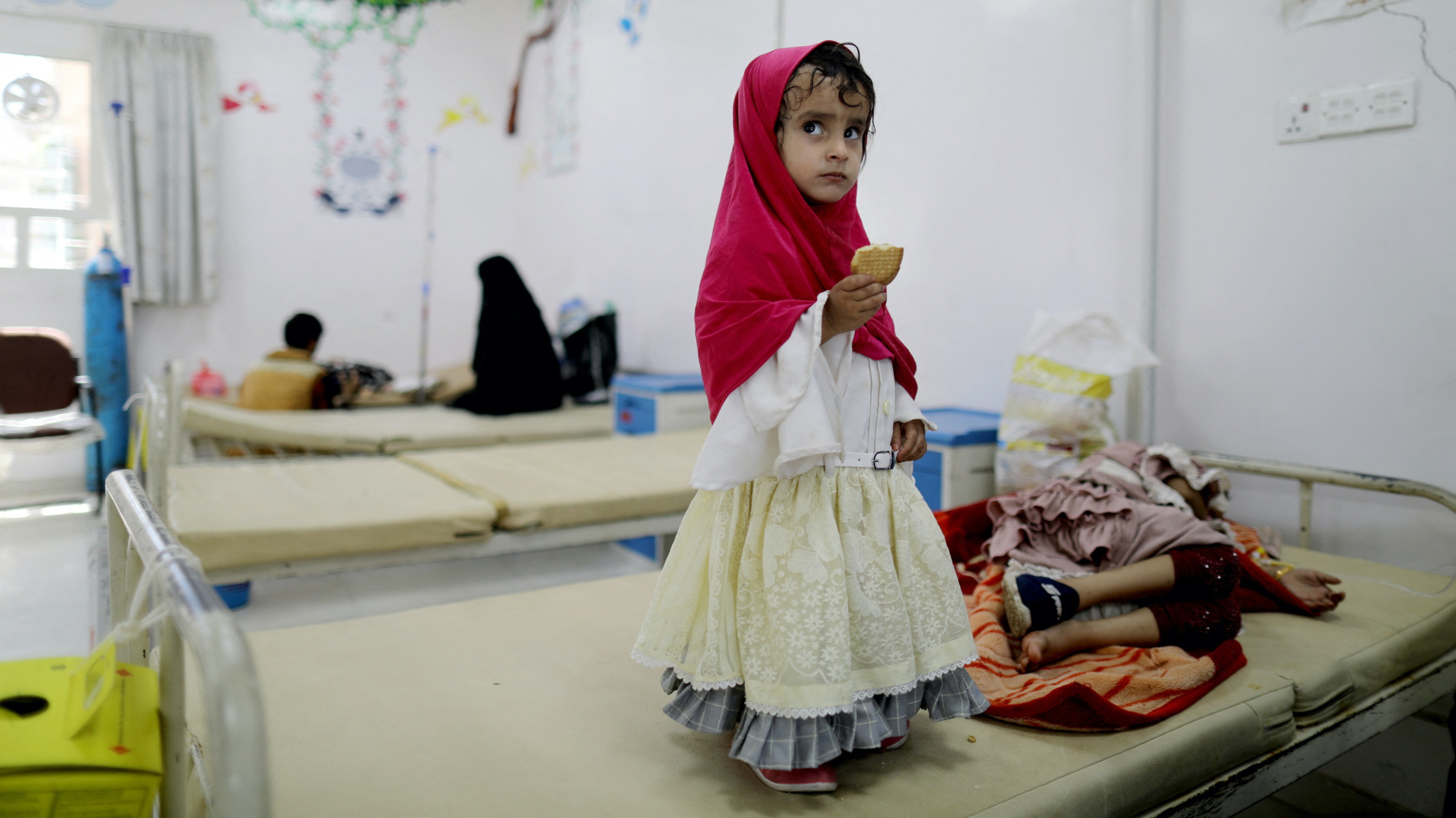 A girl stands next to her sister who is receiving treatment at a hospital in Sanaa where 10 children with leukemia died after they were given contaminated medicine, 17 October 2022 (Reuters)