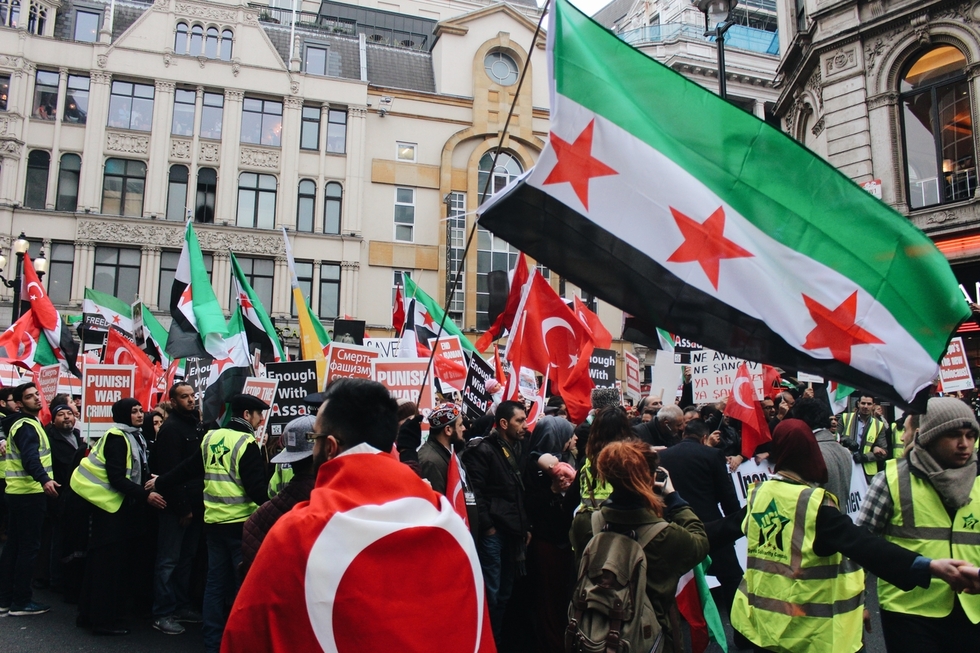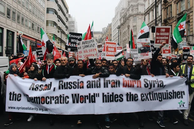 The protest ended outside Downing Street, where thousands gathered to listen to speeches from Syrians who had fled Aleppo amid the brutal civil war.