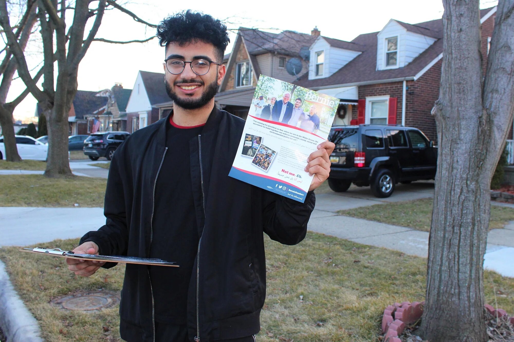 In a predominantly Arab-American neighbourhood near Dearborn's Warren Avenue, the Iraqi-American teen goes door-to-door, knocking patiently and making his case for the Vermont Senator.