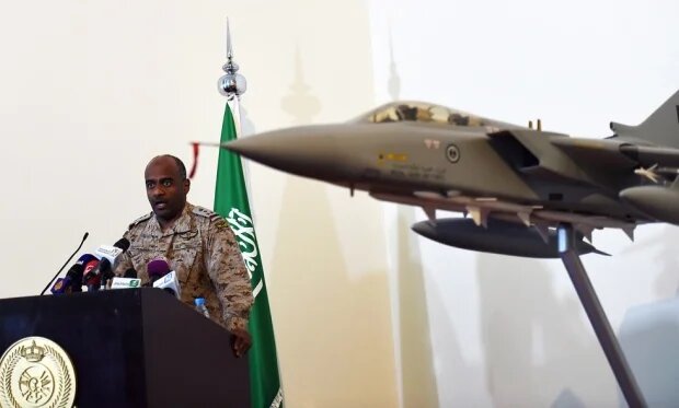 Légende photo : le général de brigade saoudien Ahmed Asiri, porte-parole des forces de la coalition dirigée par l'Arabie saoudite, s'exprime devant les médias dans la base aérienne de Riyad, capitale saoudienne, le 26 mars (AFP).
