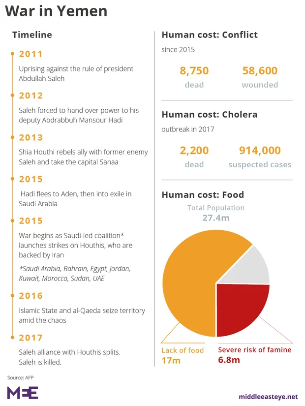 According to UN estimates, some seven million people in Yemen depend entirely on food aid and are on the brink of famine and nearly 900,000 have been infected with cholera.