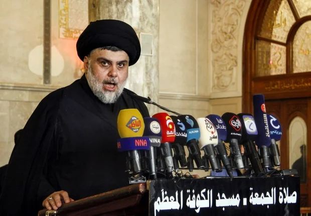 Iraqi Shia leader Muqtada al-Sadr delivers a speech at the grand mosque of Kufa on 21 September (AFP)