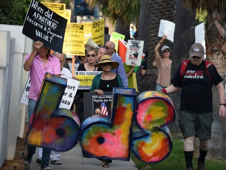 Photo: Pro-Palestinian demonstrators, carrying a sign promoting the BDS movement, march against US aid to Israel in August 2016 in Beverly Hills, California (AFP)