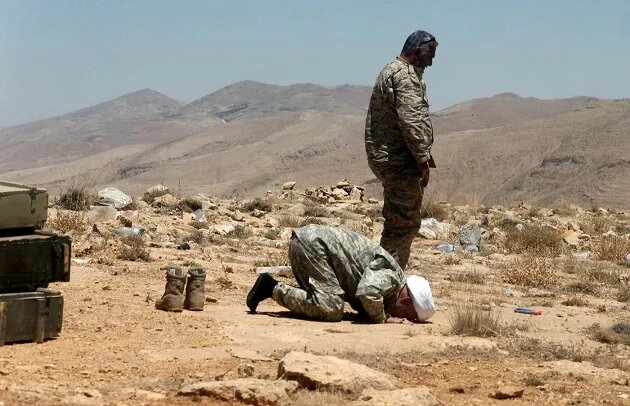 Photo: Hezbollah fighters pray at Juroud Arsal on the Syria-Lebanon border on 25 July 2017 (AFP)