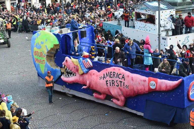 Photo: A carnival float depicting a dragon, a globe and the phrase “America First” is seen at a carnival parade on 12 February 2018 in Dusseldorf, Germany (AFP)