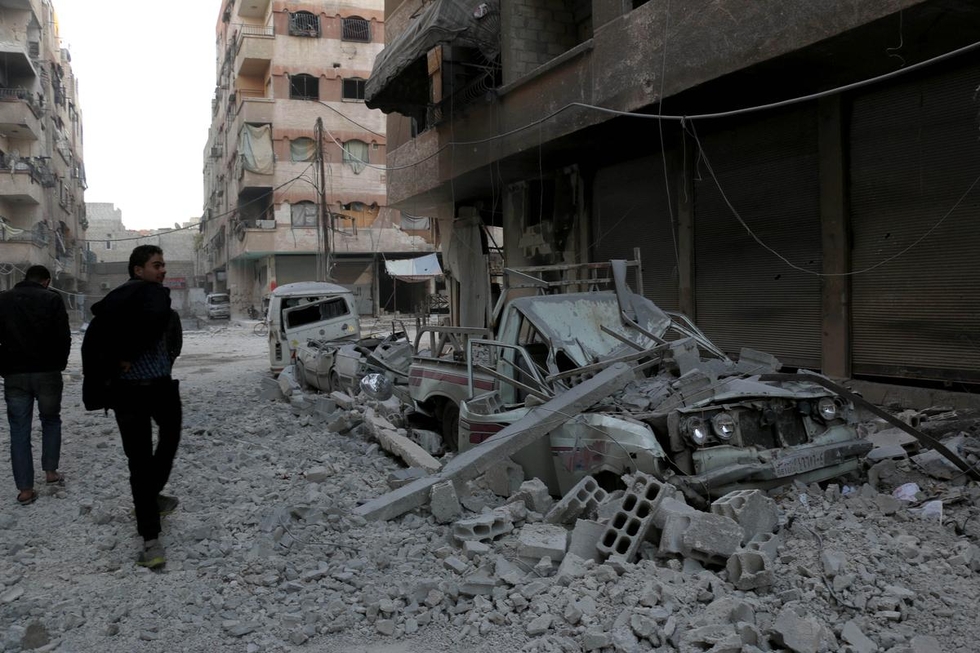 Photo: Syrians inspects a damaged building after a reported government air attack on residential areas in Ayn Terma town, in the eastern Gouta region of Damascus, Syria on 20 November, 2015 (AA).