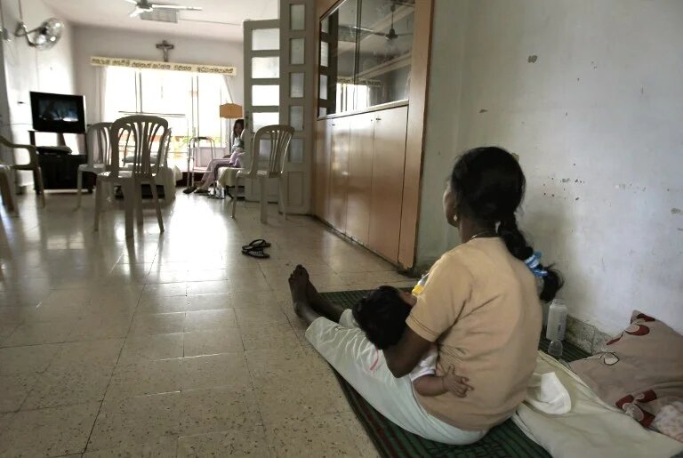 Photo: A foreign domestic worker nurses her friend's baby as she sits in the living room of a shelter run by Caritas at an undisclosed location in Lebanon on 8 June 2010. Caritas, a non-profit organization, runs the shelter for foreign domestic workers fleeing from abusive employers (AFP)