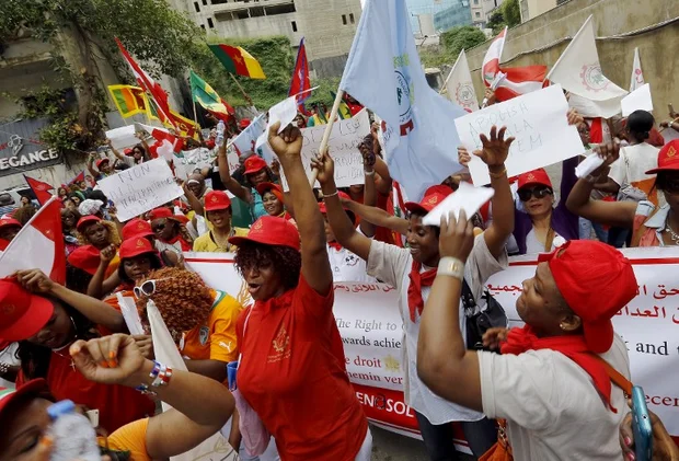 Foreign domestic workers demand increased rights from the Lebanese state and their embassies, in Beirut's Hamra district, on International Labour Day in May 2015 (AFP)