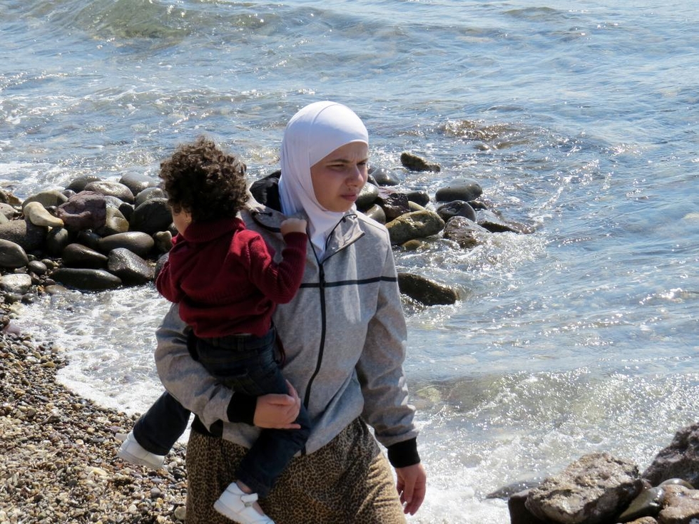 Photo: A woman carries her baby near the Ayvacik District of Canakkale, Turkey, after being caught trying to take a boat to Lesbos on 25 September 2015. (AA)