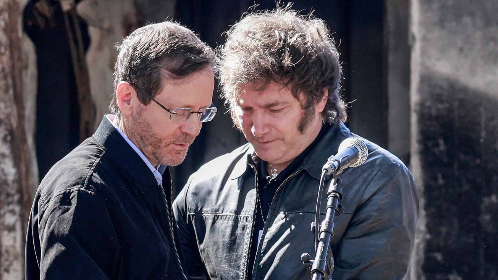Argentina's President Javier Milei embraces Israel's President Isaac Herzog during remarks to the media as they tour around Kibbutz Nir Oz on 8 February, 2024 (AFP)