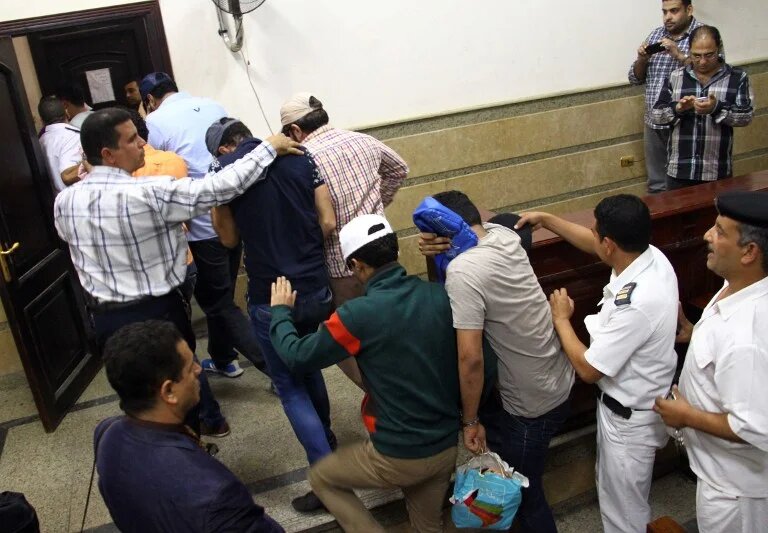 Photo credit: Egyptian men on trial for doing a video prosecutors claimed was of a gay wedding enter the courtroom in Cairo on 1 November 2014 (AFP)