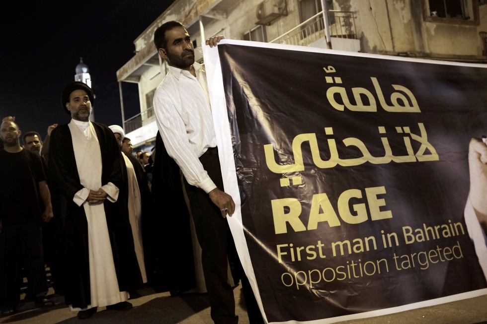 Photo credit: Bahrainis attend a protest against the arrest of the head of the banned Shiite opposition movement Al-Wefaq, Sheikh Ali Salman on December 31, 2014 in Sanabis, west of Manama (AFP)