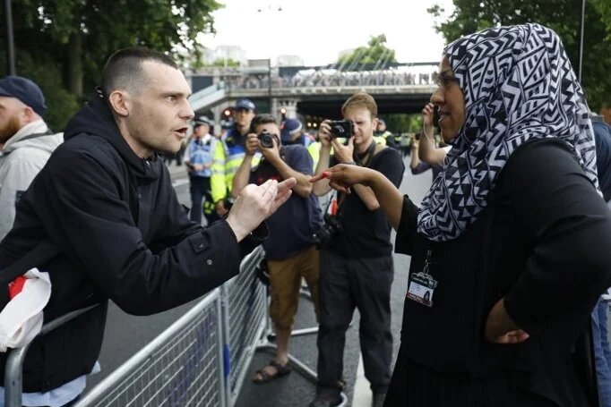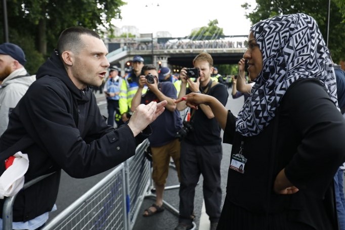 Photo: A man gestures at a woman wearing a headscarf at a demonstration organised by the far-right group the English Defence League (EDL) in central London on 24 June 2017 (AFP)
