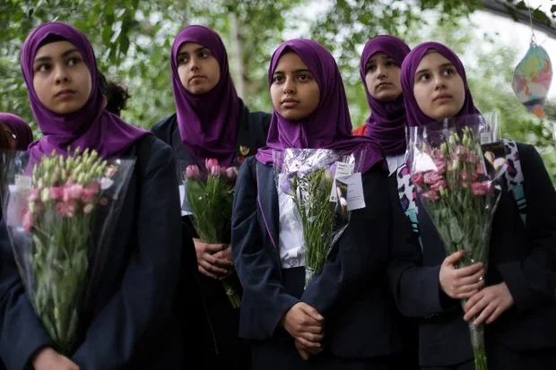 Pupils from Eden Girls' School in Walthamstow holds flowers at Potters Fields Park in London on 5 June, 2017 (AFP)