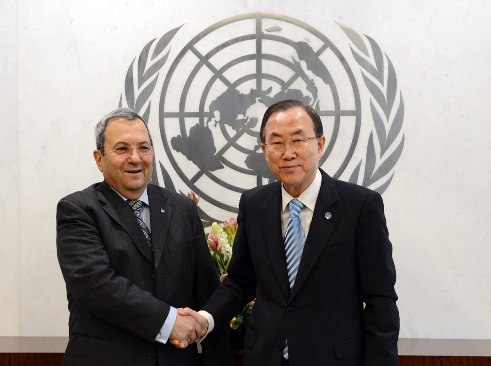 Photo credit: Ehud Barak (L), Defense Minister of Israel shakes hands with United Nations Secretary General Ban Ki-Moon (R) before their meeting March 6, 2013 at UN headquarters in New York. (AFP)