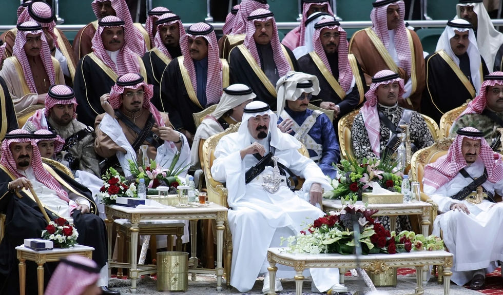 Photo: King Abdullah bin Abdul Aziz (C), Prince Meshaal bin Abdul Aziz (L) and Prince Miteb bin Abdul Aziz (R) look at royal princes taking part in the traditional Arda dance or War dance during the Janadriyah Festival of Heritage and Culture on the outskirts of the Saudi capital Riyadh, late 20 February 2007 (AFP)