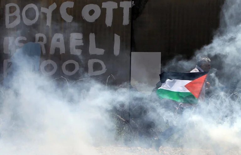 Photo: A Palestinian protestor holds his national flag as he walks near a section of Israel's separation barrier amidst tear gas smoke fired by Israeli troops to disperse a weekly protest against Israeli occupation, on 13 June 2014 in the West Bank village of Bilin. (AFP)