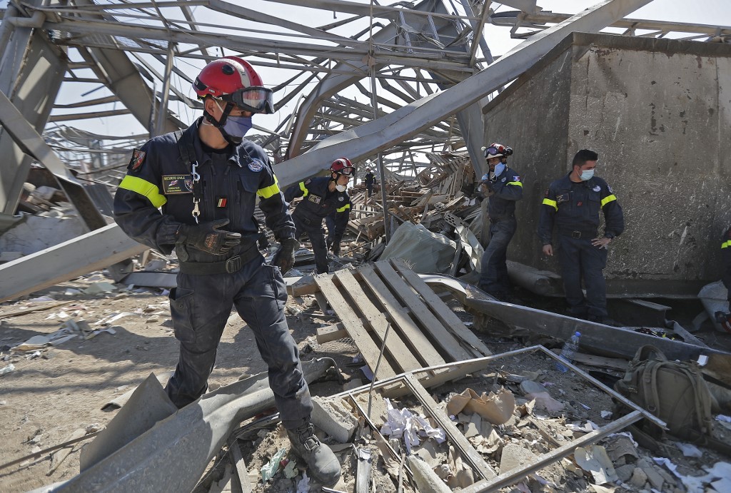 Rescue workers search through the rubble at Beirut’s devastated port on 7 August (AFP)
