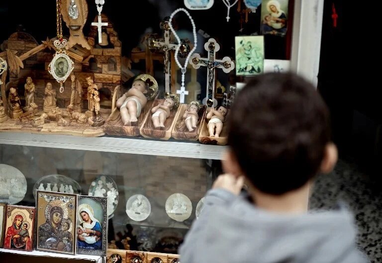 Photo: A boy looks at Christ Child figurines displayed in a shop in the Biblical West Bank city of Bethlehem, on 22 December, 2018, three days ahead of the Christmas celebration (AFP)