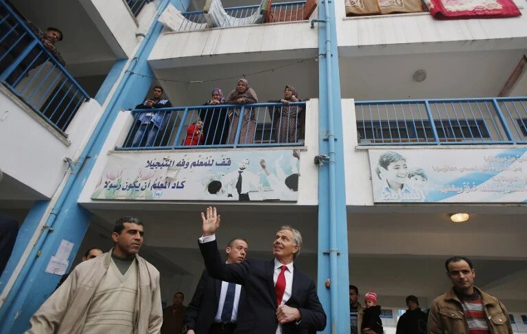 Photo credit: Middle East Quartet envoy Tony Blair waves last month as he leaves a UN-run school in Gaza City sheltering Palestinians, whose houses were destroyed by Israeli shelling during the 50-day war last summer (AFP)