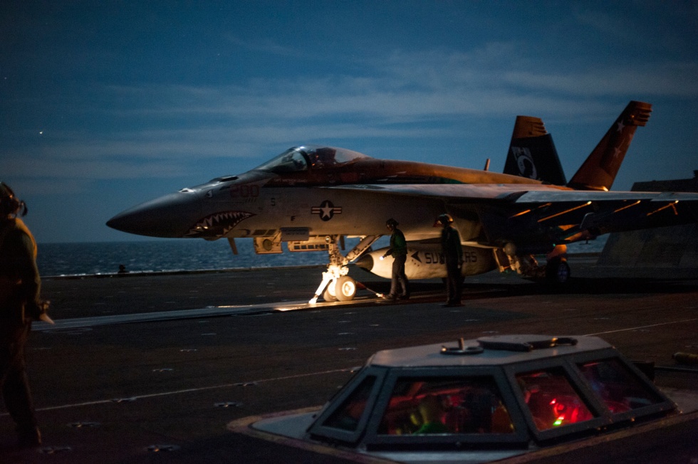 Photo: US Navy handout photo an F/A-18F Super Hornet taxiing onto a catapult during night flight (AFP photo / Handout/ US Navy /MC2 John Philip Wagner Jr)